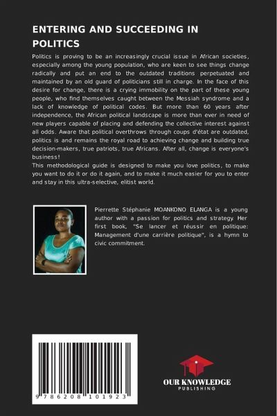 Politics is proving to be an increasingly crucial issue in African societies, especially among the young population, who are keen to see things change radically and put an end to the outdated traditions perpetuated and maintained by an old guard of politicians still in charge. In the face of this desire for change, there is a crying immobility on the part of these young people, who find themselves caught between the Messiah syndrome and a lack of knowledge of political codes. But more than 60 years after independence, the African political landscape is more than ever in need of new players capable of placing and defending the collective interest against all odds. Aware that political overthrows through coups d'état are outdated, politics is and remains the royal road to achieving change and building true decision-makers, true patriots, true Africans. After all, change is everyone's business!This methodological guide is designed to make you love politics, to make you want to do itor do it again, and to make it much easier for you to enter and stay in this ultra-selective, elitist world.