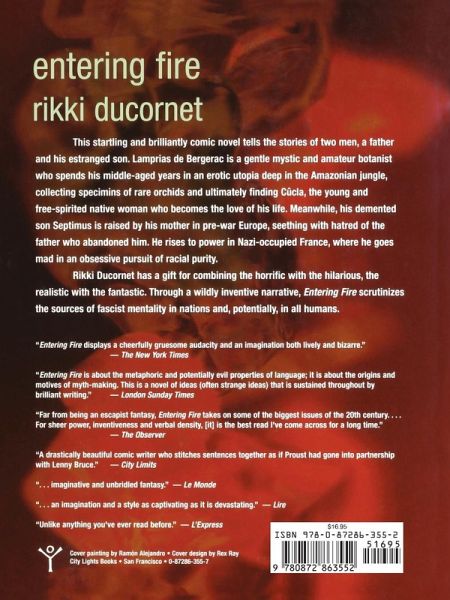 This startling and brilliantly comic novel tells the stories of two men: a father and his estranged son. Lamprias de Bergerac is a gentle mystic and amateur botanist who spends his middle-aged years in an erotic utopia deep in the Amazonian jungle, collecting specimens of rare orchids and ultimately finding Cucla, the young and free-spirited native woman who has become the love of his life. Meanwhile, his demented son Septimus is raised by his mother in prewar Europe, seething with hatred of the father who abandoned him. He rises to power in Nazi-occupied France, where he goes mad in an obsessive pursuit of racial purity. Rikki Ducornet has a gift for combining the horrific with the hilarious, the realistic with the fantastic. Through a wildly inventive narrative, Entering Fire scrutinizes the sources of fascist mentality in nations and, potentially, in all humans. "Linguistically explosive and socially relevant, [her] works are solid evidence that Rikki Ducornet is one of the most interesting writers around ... We are living in an age of intellectual and emotional starvation that is largely without spirituality, cynical about social change and disconnected from the natural world. We need writers to look at these difficult issues in a sophisticated manner. Ducornet has done this. She is the mirror of our innermost selves. And she gives us back to ourselves—despairing , hopeful, active, contemplative, fractured but surviving, playful, even happy sometimes, and always whole ... Ducornet's villains have the best lines ... one only has to think of Hitler or PolPot or any of our assorted tyrants to know that Ducornet's figures are ... taken from life."—The Nation "Entering Fire displays a cheerfully gruesome audacity and an imagination both lively and bizarre."—The New York Times "Entering Fire is about the metaphoric and potentially evil properties of language; it is about origins and motives of myth-making. This is a novel of ideas (often strange ideas) that is sustained throughout by brilliant writing."—London Sunday Times "Far from being an escapist fantasy, Entering Fire takes on some of the biggest issues of the 20th century … For sheer power, inventiveness and verbal density, [it] is the best read I've come across for a long time."— The Observer "A drastically beautiful comic writer who stitches sentences together as if Proust had gone into partnership with Lenny Bruce."—City Limits " … imaginative and unbridled fantasy."—Le Monde " … an imagination and a style as captivating as it is devastating."—Lire "Unlike anything you've ever read before."—L'Express Rikki Ducornet has a gift for combining the horrific with the hilarious, the realistic with the fantastic. Through a wildly inventive narrative, Entering Fire scrutinizes the sources of fascist mentality in nations and, potentially, in all humans.