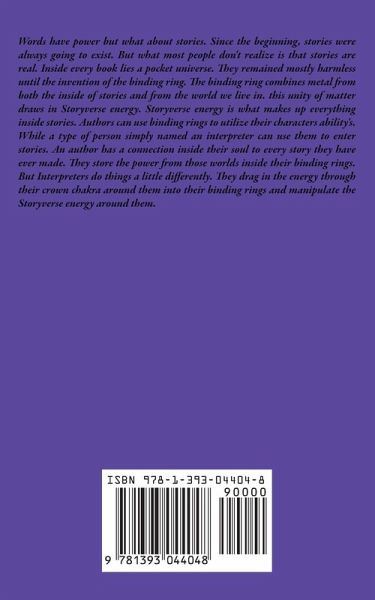 Words have power but what about stories. Since the beginning, stories were always going to exist. But what most people don't realize is that stories are real. Inside every book lies a pocket universe. They remained mostly harmless until the invention of the binding ring. The binding ring combines metal from both the inside of stories and from the world we live in. this unity of matter draws in Storyverse energy. Storyverse energy is what makes up everything inside stories. Authors can use binding rings to utilize their characters ability's. While a type of person simply named an interpreter can use them to enter stories. An author has a connection inside their soul to every story they have ever made. They store the power from those worlds inside their binding rings. But Interpreters do things a little differently. They drag in the energy through their crown chakra around them into their binding rings and manipulate the Storyverse energy around them.