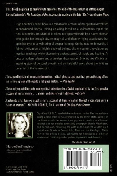 Olga Kharitidi's debut book is a remarkable account of her spiritual adventure in snowbound Siberia. Joining an ailing friend on a spontaneous trip to the Atai Mountains, Dr. Kharitidi is taken into apprenticeship by a native Shaman who guides her through bizarre, magical, and often terrifying experiences that open her eyes to a wellspring of deeper learning. On the road to Belovedia, a fabled civilization of highly evolved beings, she encounters revolutionary mystical teachings while discovering ancient secrets of magic and healing. At once a modern odyssey and a timeless dreamscape, Entering the Circle is an inspiring story of personal growth and an insightful work about the limitless potential of human spirit.