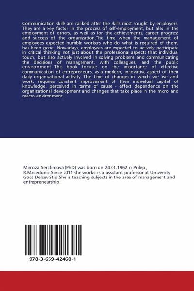 Communication skills are ranked after the skills most sought by employers. They are a key factor in the process of self-employment, but also in the employment of others, as well as for the achievements, career progress and success of the organization.The time when the management of employees expected humble workers who do what is required of them, has been gone. Nowadays, employees are expected to actively participate in critical thinking not just about the professional aspects that individual touch, but also actively involved in solving problems and communicating the decisions of management, with colleagues, and the public environment. This book focuses on the importance of effective communication of entrepreneurs, as a modern, innovative aspect of their daily organizational activity. The time of changes in which we live and work, requires constant improvement of their individual capital of knowledge, perceived in terms of cause - effect dependence on the organizational development and changes that take place in the micro and macro environment.