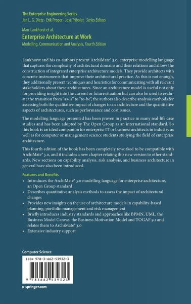 This fourth edition of the book has been completely reworked to be compatible with ArchiMate® 3.0, and it includes a new chapter relating this new version to other standards. New sections on capability analysis, risk analysis, and business architecture in general have also been introduced.