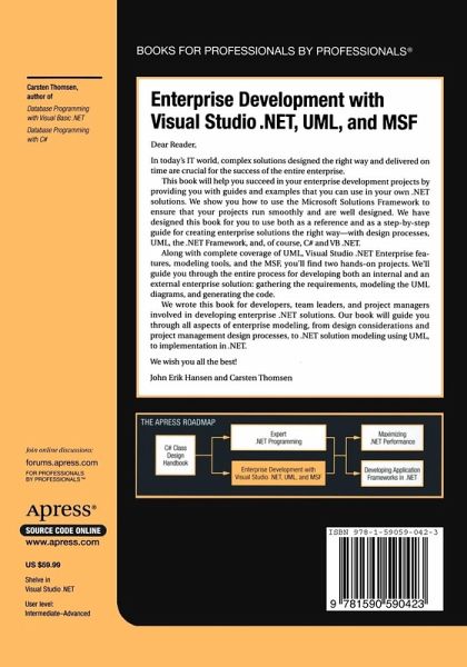 Using Visual Studio .NET (VS .NET) for creating enterprise solutions, authors John Hansen and Carsten Thomsen have chosen to add the Unified Modeling Language (UML), for designing and documenting solutions, and the Microsoft Solutions Framework (MSF), for planning and managing projects.