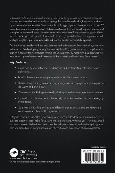 Enterprise Fortress is a comprehensive guide to building secure and resilient enterprise architectures, aimed at professionals navigating the complex world of cybersecurity. Authored by cybersecurity leader Alex Stevens, the book brings together his experience of over 20 years, blending technical expertise with business strategy. It covers everything from foundational principles to advanced topics, focusing on aligning security with organisational goals. What sets this book apart is its practical, real-world focus - grounded in hands-on experience and strategic insights, it provides actionable advice that can be immediately applied.
