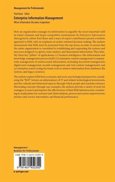How an organization manages its information is arguably the most important skill in today's dynamic and hyper-competitive environment. In Enterprise Information Management, editor Paul Baan and a team of expert contributors present a holistic approach to EIM, with an emphasis on action-oriented decision making. The authors demonstrate that EIM must be promoted from the top down, in order to ensure that the entire organization is committed to establishing and supporting the systems and processes designed to capture, store, analyze, and disseminate information. They identify three key "pillars" of applications: (1) business intelligence (the information and knowledge management process itself); (2) enterprise content management (company-wide management of unstructured information, including document management, digital asset management, records management, and web content management); and (3) enterprise search (using electronic tools to retrieve information from databases, file systems, and legacy systems).
