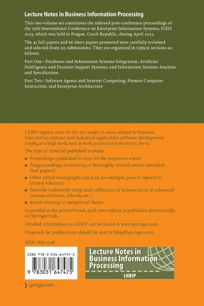 This two-volume set constitutes the refereed post-conference proceedings of the 25th International Conference on Enterprise Information Systems, ICEIS 2023, which was held in Prague, Czech Republic, during April 2023. The 41 full papers and 66 short papers presented were carefully reviewed and selected from 213 submissions. They are organized in topical sections as follows: Part One : Databases and Information Systems Integration; Artificial Intelligence and Decision Support Systems; and Information Systems Analysis and Specification. Part Two : Software Agents and Internet Computing; Human-Computer Interaction; and Enterprise Architecture. …mehr