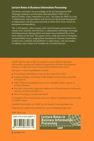 This book constitutes the proceedings of the Fourth International IFIP Working Conference on Enterprise Interoperability (IWEI 2012) , held in Harbin, China, September 6-7, 2012. The theme for IWEI 2012 was "Collaboration, Interoperability and Services for Networked Enterprises", so submissions and discussions focused on these three areas critical for enterprise interoperability.