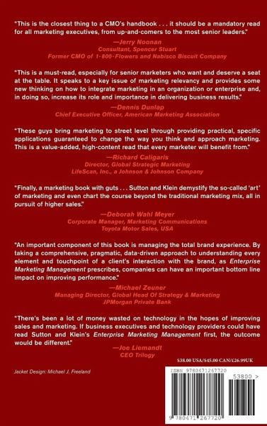 Top executives at the renowned Zyman Marketing Group introduce a revolutionary new method for marketing managers-Enterprise Marketing Management (EMM). EMM systematically links marketing to all the essential functions within an organization, realigning the enterprise to put marketing efforts and customer service at its core. With an introduction by marketing guru Sergio Zyman, Enterprise Marketing Management covers topics such as brand architecture, investment measurement, and how to engineer creativity. EMM, adopted by many Z-Marketing clients, is a proven strategy for transforming organizations and achieving bottom-line results.