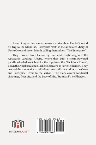 Some of my earliest memories were stories about Uncle Otto and his trip to the Klondike. Enterprise North is the annotated diary of Uncle Otto and seven friends calling themselves, "The Enterprise." The travel from Detroit by train and freight wagon to the Athabasca Landing, Alberta, where they built a steam-powered paddle wheeled York boat for the trip down the "Backdoor Route", down the Athabasca and Mackenzie Rivers, to Fort McPherson. They crossed the mountains at 40 below zero and boated down the Crow and Porcupine Rivers to the Yukon. The diary covers accidental shootings, frost bite, and the baby of Mrs. Braun at Ft. McPherson.