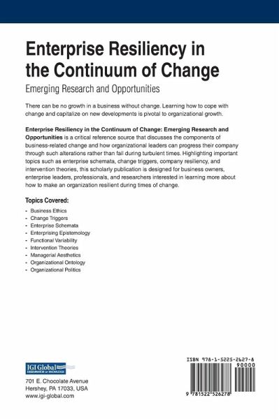 There can be no growth in a business without change. Learning how to cope with change and capitalize on new developments is pivotal to organizational growth. Enterprise Resiliency in the Continuum of Change: Emerging Research and Opportunities is a critical reference source that discusses the components of business-related change and how organizational leaders can progress their company through such alterations rather than fail during turbulent times. Highlighting important topics such as enterprise schemata, change triggers, company resiliency, and intervention theories, this scholarly publication is designed for business owners, enterprise leaders, professionals, and researchers interested in learning more about how to make an organization resilient during times of change.