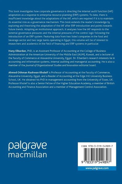 This book investigates how corporate governance is directing the internal audit function (IAF) adaptation as a response to enterprise resource planning (ERP) systems. To date, there is insufficient knowledge about the adaptations of the IAF, which are required if it is to maintain its essential role as a governance mechanism. This book extends the reader's knowledge by exploring and theorising the adaptation of the IAF after ERP introduction and points towards future trends. Adopting an institutional approach, it analyses how the IAF responds to the external governance pressures and the internal pressures of the control logic following the introduction of an ERP system. Featuring data from two listed companies in the food and beverage sector and two large banks operating in Egypt, this volume will be of interest to researchers and academics in the field of financing and ERP systems in particular.