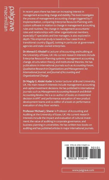 DR. AHMED O. KHOLEIF is Lecturer of Accounting and Auditing at the University of Alexandria, Egypt. His current research interests include Enterprise Resource Planning systems, management accounting change, structuration theory, and institutional theories. He has publications in some international conferences and journals such as Qualitative Research in Organizations and Management: An International Journal of Accounting and Organizational Change. DR. MAGDY G. ABDEL-KADER is a Senior Lecturer at Brunel University, UK. His main research interests include management accounting and capital investment decisions. He has published in international journals such as Management Accounting Research and British Accounting Review. He is a co-author of books on investment decision in AMT and performance evaluation of new product development teams and co-editor of a book on performance evaluation of shop floor workers. PROFESSOR MICHAEL J. SHERER is Professor of Accounting and Auditing at the University of Essex, UK. His current research interests include the impact and evaluation of cultural investment; the value of auditing in corporate governance, and business planning in universities. He has written two books on auditing and has published articles in major international journals.
