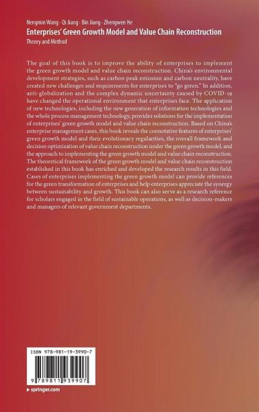 Chapter 1. An overview of enterprises' green growth model and value chain reconstruction.- Chapter 2. The formation of enterprises' green growth model.- Chapter 3. The trend of enterprises' green growth model.- Chapter 4. The strategical matching of enterprises' green growth model.- Chapter 5. The reconstruction and innovation of value chain of enterprises' green growth model.- Chapter 6. The network design of enterprises' green growth model.- Chapter 7. The building of value chain and coordination of the membership.- Chapter 8. Green product design and innovation.- Chapter 9. Green product pricing.- Chapter 10. Green procurement and outsourcing.- Chapter 11. Manufacturing and remanufacturing.- Chapter 12. Inventory management.- Chapter 13. Green Logistics.- Chapter 14. Collection and resource recycling.- Chapter 15. Supply disruptions and reconstruction of value chain.- Chapter 16. The organization of reconstruction of value chain.- Chapter 17. Social responsibility management.-Chapter 18. Performance management.