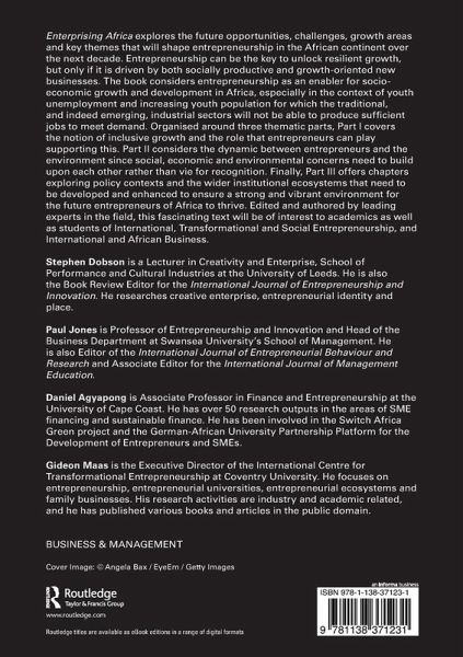 Stephen Dobson is a Lecturer in Creativity and Enterprise, School of Performance and Cultural Industries at the University of Leeds. He is also the book review Editor for the International Journal of Entrepreneurship and Innovation. He researches creative enterprise, entrepreneurial identity and place. Paul Jones is Professor of Entrepreneurship and Innovation and Head of the Business Department at Swansea University's School of Management. He is also Editor of the International Journal of Entrepreneurial Behaviour and Research and Associate Editor for the International Journal of Management Education. Daniel Agyapong is Associate Professor in Finance and Entrepreneurship at the University of Cape Coast. He has over 50 research outputs in the areas of SME financing and sustainable finance. He has been involved in the Switch Africa Green project and the German-African University Partnership Platform for the Development of Entrepreneurs and SMEs. Gideon Maas is the Executive Director of the International Centre for Transformational Entrepreneurship at Coventry University. He focuses on entrepreneurship, entrepreneurial universities, entrepreneurial ecosystems and family businesses. His research activities are industry and academic related, and he has published various books and articles in the public domain.