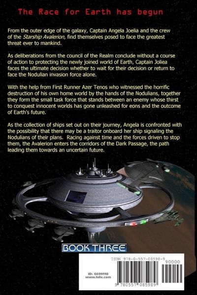 From the outer edge of the galaxy, Captain Angela Joelia and the crew of the Starship Avalerion find themselves posed to face the greatest threat ever to Earth. As deliberations from the council conclude without a course of action, Captain Joliea faces the ultimate decision whether to wait for help or return to face the Nodulian invasion force alone. With the help from Azer Tenos who witnessed the destruction of his own home world, together they form a force that will stand between an enemy whose thirst to conquest innocent worlds has gone unleashed for eons. As the collection of ships set out on their journey, Angela is confronted with a fact there may be a traitor on board her ship signaling the Nodulians of their plans. Racing against time and the forces driven to stop them, the Avalerion enters the corridors of the Dark Passage, a path leading them towards the uncertain future.