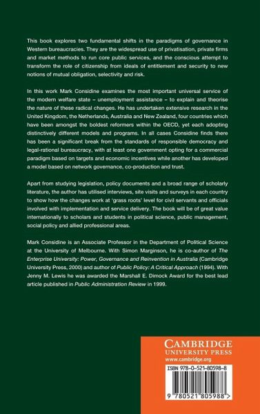This book, first published in 2001, explores two shifts in the paradigms of governance in Western bureaucracies. They are the widespread use of privatisation, private firms and market methods to run core public services, and the conscious attempt to transform the role of citizenship from ideals of entitlement and security to notions of mutual obligation, selectivity and risk. Considine examines the most important service of the modern welfare state - unemployment assistance - to explain and theorise the nature of these radical changes. He undertakes research in the United Kingdom, the Netherlands, Australia and New Zealand, four countries which have been among the boldest reformers within the OECD, yet each adopting different models. Each case is a break from the standards of responsible democracy and legal-rational bureaucracy, with at least one government opting for a commercial paradigm based on targets and economic incentives and another opting for a model based on network governance, co-production and trust.