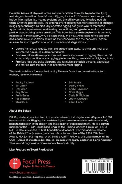 Foreword Chapter 1: Forces & Formulas Chapter 2: Structural Behavior Chapter 3: Lighting Truss Chapter 4: Arena Rigging Chapter 5: Outdoor Roof Structures Chapter 6: Counterweight Rigging Chapter 7: Aerialist Rigging Chapter 8: Performer Flying Chapter 9: Stage Automation Chapter10: The Mechanics of Stage Automation Chapter11: Training in the Twenty-First Century (US version) Chapter12: Training in the Twenty-First Century (UK version) Chapter 13: Working Safely at Height Chapter 14: Medical Issues in Fall Arrest/Rescue