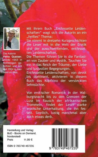 Mit ihrem Buch Entfesselte Leidenschaften wagt sich die Autorin an ein heißes Thema: Sie nimmt in dreizehn Kurzgeschichten die Leser mit in die Welt der Erotik und der ausschweifenden, entfesselten Leidenschaften. Die Themen führen Sie in die Fantasien von Zauber und Mystik. Tauchen Sie ein in das Reich der Träume, der Liebe und lustvollen Begegnungen. Entfesselte Leidenschaften, von devot bis dominant, aktivieren in diesem Buch das Kopfkino der versteckten Sehnsüchte.