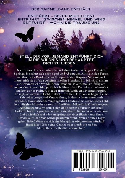Dark Romance Stell dir vor, jemand entführt dich in die Wildnis und behauptet, dich zu lieben ... Nichts hasst Louisa mehr, als das Leben in dem winzigen Kaff Ash Springs. Sie sehnt sich nach Spaß und Abenteuer. Als sie in den Ferien mit ihren vier Brüdern zum Campen in den Sequoia Nationalpark muss, trifft sie auf den geheimnisvollen Brendan. Ihr Schicksal nimmt eine dramatische Wende, denn Brendan ist keinesfalls zufällig am selben Ort. Er verschleppt sie in die Einsamkeit Kanadas, an einen Ort, an dem es nur Fichten, blauen Himmel, Wölfe und Hermeline gibt. Er sagt, sie wäre sein Licht in der Dunkelheit. Für Louisa beginnt eine Zeit voller Angst und Verzweiflung, in der sie immer mehr mit Brendans traumatischer Vergangenheit konfrontiert wird. Schon bald ist er für sie viel mehr als nur ihr Entführer. Mitgefühl, Zuneigung und Abhängigkeit vermischen sich und stürzen Louisa in ein tiefes Gefühlschaos ... irgendwann glaubt sie, ihn zu lieben. Aber ¿ ist diese Liebe wirklich real oder entspringt sie einer Illusion und ihrer Einsamkeit? Und was würde passieren, wenn Bren sie eines Tages gehen ließe? Wenn sie sich ein Jahr später wiedersehen würden? Hätte diese Liebe eine Chance oder würde sie an den Maßstäben der Realität zerbrechen? Dieser Sammelband umfasst: Entführt ¿ Bis du mich liebst Entführt ¿ Zwischen Himmel und Wind Entführt ¿ Wohin die Träume uns tragen