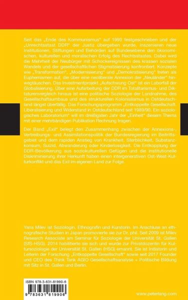Der Band "Exil" belegt den Zusammenhang zwischen der Annexions-, Vertreibungs- und Assimilationspolitik der Bundesregierung im Beitrittsgebiet und dem rapiden Anstieg von Krankheit, Sterblichkeit, Substanzkonsum, Suizid, Abwanderung oder Kinderlosigkeit. Die Entkopplung der DDR-Bevölkerung aus soziokulturellen Gefügen und die institutionelle Diskriminierung ihrer Herkunft haben einen intergenerativen Ost-West-Kulturkonflikt und das Exil im eigenen Land zur Folge.