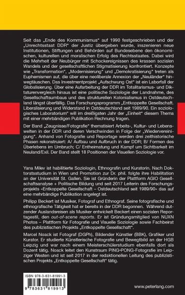 Der Band »Zeugnisse/Fotografie« thematisiert Arbeits-, Kultur- und Lebenswelten in der DDR und deren Verschwinden in Folge der »Wiedervereinigung«. Anhand von Fotografie und Reportage werden drei zeithistorische Phasen rekonstruiert: A/ Aufbau und Aufbruch in der DDR; B/ Formen des Überlebens im Umbruch; C/ Entheimatung und Kampf um Sichtbarkeit im Neuland/Exil. Der Band stellt 18 Positionen der Visuellen Soziologie vor, mit Fotografien von Christian Borchert, Ralf Anders, Evelyn Richter, Harald Kirschner, Eva Mahn, Roger und Renate Rössing, Thomas Uhlemann, Maria Notbohm, Jens Rötzsch, Yana Milev, Barbara Klemm, Maix Mayer, Andreas Rost, Philipp Beckert, Marcel Noack und Jürgen Matschie sowie mit Texten von Heinz Czechowski, Matthias Flügge, Hans-Joachim Lauck, Paul Dessau, Wolfgang Kil, Eva Mahn, Hans-Georg-Sehrt, Andreas Raabe, Kurt Schneider, Jörg Roesler, Christoph Tannert, Die Redaktion, Renate Rauch, Bertram Kaschek, Peter Gosztony, Christina Bogusz, Die Herausgeber sowie einem Grusswort von Peter Weibel und Silke Wagler.