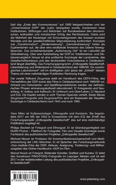 Der zweite Teilband Zeugnisse stellt ein Handbuch des DEFA-Films, des Fernsehfilms der DDR sowie des Films in Ostdeutschland nach 1989/90 vor. Anhand von Dokumentar- und Spielfilmproduktionen werden vier zeithistorischen Phasen erinnerungskulturell rekonstruiert: 0/ Kriegsende und Neuanfang; A/ Aufbau und Aufbruch; B/ Umbruch und Über/Leben; C/ Neuland und Exil. Die Kapitel werden in acht Themen-Specials vertieft. Beide Bände Zeugnisse/Fotografie und Zeugnisse/Film sind ein Basiswerk der Visuellen Soziologie in Ostdeutschland nach 1945 und nach 1990.