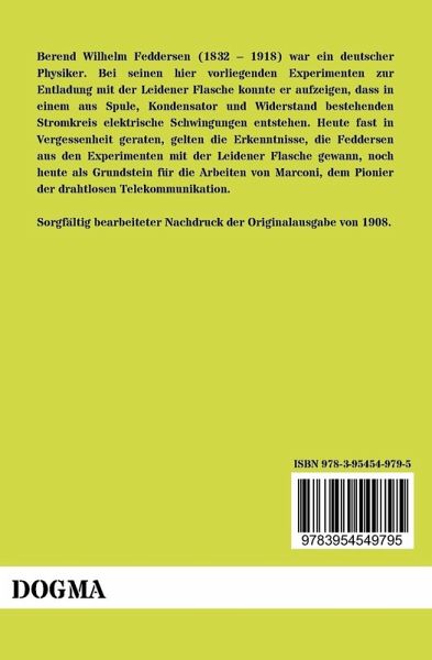 Berend Wilhelm Feddersen (1832 1918) war ein deutscher Physiker. Bei seinen hier vorliegenden Experimenten zur Entladung mit der Leidener Flasche konnte er aufzeigen, dass in einem aus Spule, Kondensator und Widerstand bestehenden Stromkreis elektrische Schwingungen entstehen. Heute fast in Vergessenheit geraten, gelten die Erkenntnisse, die Feddersen aus den Experimenten mit der Leidener Flasche gewann, noch heute als Grundstein für die Arbeiten von Marconi, dem Pionier der drahtlosen Telekommunikation.