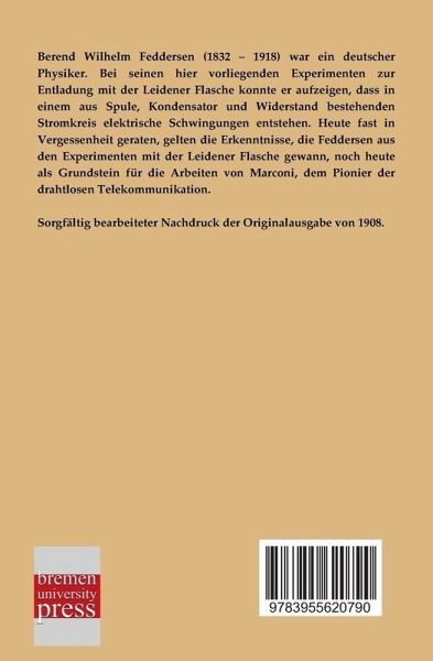 Berend Wilhelm Feddersen (1832 1918) war ein deutscher Physiker. Bei seinen hier vorliegenden Experimenten zur Entladung mit der Leidener Flasche konnte er aufzeigen, dass in einem aus Spule, Kondensator und Widerstand bestehenden Stromkreis elektrische Schwingungen entstehen. Heute fast in Vergessenheit geraten, gelten die Erkenntnisse, die Feddersen aus den Experimenten mit der Leidener Flasche gewann, noch heute als Grundstein für die Arbeiten von Marconi, dem Pionier der drahtlosen Telekommunikation.