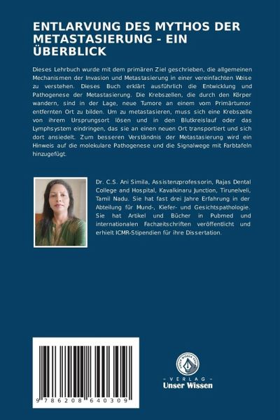 Dieses Lehrbuch wurde mit dem primären Ziel geschrieben, die allgemeinen Mechanismen der Invasion und Metastasierung in einer vereinfachten Weise zu verstehen. Dieses Buch erklärt ausführlich die Entwicklung und Pathogenese der Metastasierung. Die Krebszellen, die durch den Körper wandern, sind in der Lage, neue Tumore an einem vom Primärtumor entfernten Ort zu bilden. Um zu metastasieren, muss sich eine Krebszelle von ihrem Ursprungsort lösen und in den Blutkreislauf oder das Lymphsystem eindringen, das sie an einen neuen Ort transportiert und sich dort ansiedelt. Zum besseren Verständnis der Metastasierung wird ein Hinweis auf die molekulare Pathogenese und die Signalwege mit Farbtafeln hinzugefügt.