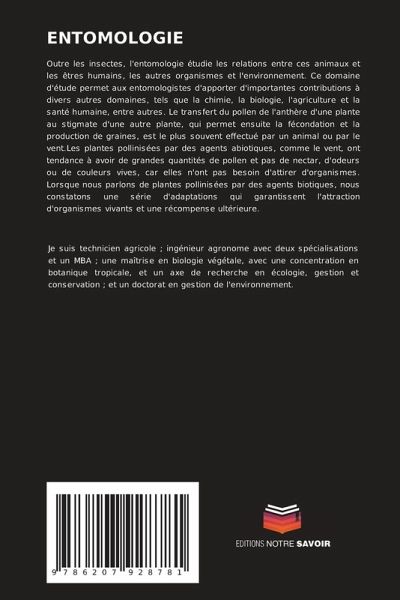 Outre les insectes, l'entomologie étudie les relations entre ces animaux et les êtres humains, les autres organismes et l'environnement. Ce domaine d'étude permet aux entomologistes d'apporter d'importantes contributions à divers autres domaines, tels que la chimie, la biologie, l'agriculture et la santé humaine, entre autres. Le transfert du pollen de l'anthère d'une plante au stigmate d'une autre plante, qui permet ensuite la fécondation et la production de graines, est le plus souvent effectué par un animal ou par le vent.Les plantes pollinisées par des agents abiotiques, comme le vent, ont tendance à avoir de grandes quantités de pollen et pas de nectar, d'odeurs ou de couleurs vives, car elles n'ont pas besoin d'attirer d'organismes. Lorsque nous parlons de plantes pollinisées par des agents biotiques, nous constatons une série d'adaptations qui garantissent l'attraction d'organismes vivants et une récompense ultérieure.