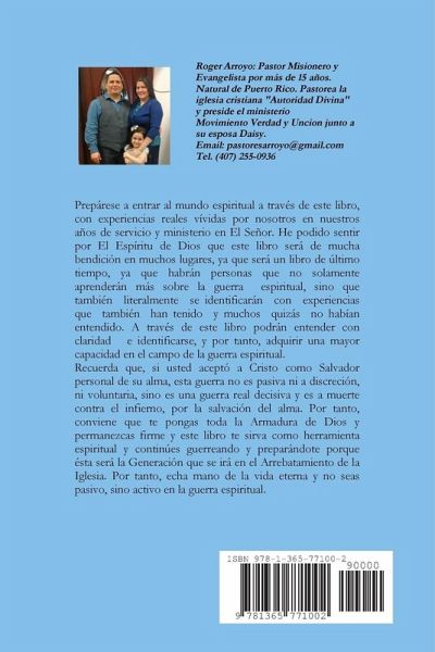 Recuerda que, si usted aceptó a Cristo como Salvador personal de su alma, esta guerra no es pasiva ni a discreción, ni voluntaria, sino es una guerra real decisiva y es a muerte contra el infierno, por la salvación del alma. Por tanto, conviene que te pongas toda la Armadura de Dios y permanezcas firme y este libro te sirva como herramienta espiritual y continúes guerreando y preparándote porque ésta será la Generación que se irá en el Arrebatamiento de la Iglesia. Por tanto, echa mano de la vida eterna y no seas pasivo, sino activo en la guerra espiritual. ESFUERZATE Y SE VALIENTE, (Josué 1.9).