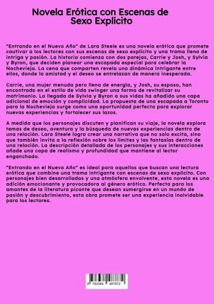 "Entrando en el Nuevo Año" de Lara Steele es una novela erótica que promete cautivar a los lectores con sus escenas de sexo explícito y una trama llena de intriga y pasión. La historia comienza con dos parejas, Carrie y Josh, y Sylvia y Byron, que deciden planear una escapada especial para celebrar la Nochevieja. La cena que comparten revela una dinámica intrigante entre ellos, donde la amistad y el deseo se entrelazan de manera inesperada.Carrie, una mujer menuda pero llena de energía, y Josh, su esposo, han encontrado en el estilo de vida swinger una forma de revitalizar su matrimonio. La llegada de Sylvia y Byron a sus vidas ha añadido una capa adicional de emoción y complicidad. La propuesta de una escapada a Toronto para la Nochevieja surge como una oportunidad perfecta para explorar nuevas experiencias y fortalecer sus lazos.A medida que los personajes discuten y planifican su viaje, la novela explora temas de deseo, aventura y la búsqueda de nuevas experiencias dentro de una relación. Lara Steele logra crear una narrativa que no solo excita, sino que también invita a la reflexión sobre los límites y las fantasías dentro de una relación. La descripción detallada de los personajes y sus interacciones añade una capa de realismo y profundidad que mantiene al lector enganchado."Entrando en el Nuevo Año" es ideal para aquellos que buscan una lectura erótica que combine una trama intrigante con escenas de sexo explícito. Con personajes bien desarrollados y una atmósfera envolvente, esta novela es una adición emocionante y provocadora al género erótico. Perfecta para los amantes de la literatura picante que desean sumergirse en un mundo de pasión y descubrimiento, esta obra promete ser una experiencia inolvidable para los lectores.