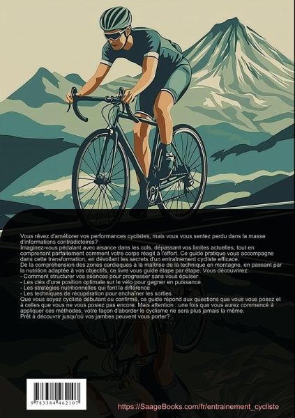 Découvrez un guide détaillé sur le cyclisme sur route qui vous accompagnera dans votre progression, quel que soit votre niveau. Ce livre sur le cyclisme aborde tous les aspects essentiels de ce sport exigeant.La première partie explore les fondamentaux physiologiques du sport cycliste, en détaillant les systèmes énergétiques, le fonctionnement musculaire et l'importance des zones de fréquence cardiaque. Vous apprendrez à structurer vos séances d'entraînement, de l'endurance fondamentale aux intervalles intensifs.Une section complète est dédiée au renforcement musculaire adapté aux cyclistes, incluant des exercices de stabilisation du tronc et de développement de l'endurance musculaire. L'accent est mis sur l'équilibre musculaire et les exercices de compensation.La technique occupe une place centrale avec des chapitres consacrés au pédalage, au pilotage et à l'optimisation du matériel. Vous découvrirez comment améliorer votre position sur le vélo et maximiser votre efficacité aérodynamique.La nutrition et la récupération, éléments clés de la performance en cyclisme, sont traitées en profondeur. Le guide détaille les besoins en glucides et protéines, l'hydratation et les stratégies de récupération active.Chaque chapitre s'appuie sur des données scientifiques actuelles et propose des applications pratiques pour votre entraînement quotidien. Des plans d'entraînement adaptables et des conseils de périodisation vous permettront de progresser méthodiquement dans votre pratique du vélo.Ce livre a été créé en utilisant des technologies innovantes telles que l'Intelligence Artificielle ainsi que des outils spécialement développés - par exemple, pour la recherche d'idées, la recherche d'informations, l'écriture, la relecture, l'assurance qualité et la conception d'illustrations décoratives.Ainsi, nous souhaitons vous offrir une expérience de lecture particulièrement cohérente, moderne et d'une qualité encore supérieure.