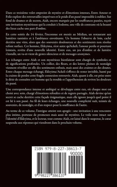 Dans ce troisième volet empreint de mystère et d'émotions intenses, Entre Amour et Folie explore des retrouvailles imprévues et le poids d'un passé impossible à oublier. Sur fond de drames et de secrets, Aïah, encore marquée par les souffrances passées, reçoit une invitation mystérieuse qui la conduit à Sodome, une ville de contraste où la beauté des lieux cache une part d'ombre. En cette soirée du 14 février, l'inconnue est menée au Médian, un restaurant aux lumières tamisées et à l'ambiance envoûtante. Un homme l'observe de loin, caché derrière une vitre, alors que des souvenirs douloureux et des sentiments non résolus refont surface. Cet homme, Ekleyima, n'est autre qu'Ackeli, l'amour perdu et pourtant lointain, revêtu d'une nouvelle identité. Entre eux, un jeu d'ombre et de lumière s'installe, un va-et-vient de gestes silencieux et de messages anonymes. Les échanges entre Aïah et son mystérieux bienfaiteur sont chargés de symboles et de significations profondes. Un collier, des fleurs, et des lettres pleines de nostalgie viennent réveiller en elle des sentiments enfouis, mais aussi des craintes et des doutes. Entre chaque message échangé, Ekleyima/Ackeli s'efforce de rester invisible, hanté par la crainte de perdre cette fragile connexion retrouvée. Aïah, quant à elle, est prise entre le désir de connaître cet homme qui la trouble et l'appréhension de revivre les douleurs du passé. Une correspondance intense et ambiguë se développe entre eux, où chaque mot est choisi avec soin, chargé d'émotions refoulées et de regrets partagés. Aïah devine qu'un secret se cache derrière cette façade énigmatique, mais elle ignore jusqu'à quel point il est lié à son passé. Au fil de leurs échanges, une nouvelle complicité naît, teintée de souvenirs, de nostalgie, et d'un respect pour la souffrance de l'autre. Au terme de ce volume, l'intrigue atteint son apogée : une invitation à une rencontre plus intime, porteuse de promesses mais aussi de mystères. Le voile reste intact sur l'identité d'Ekleyima, et le lecteur, tout comme Aïah, est laissé dans le suspense, le c¿ur suspendu aux réponses qui viendront dans le prochain volume.
