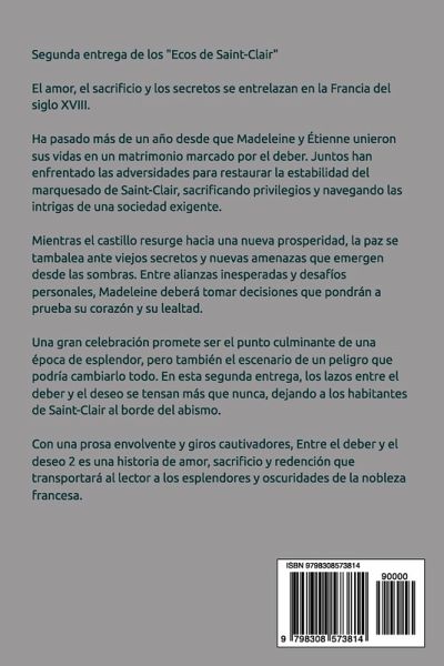 Segunda entrega de los "Ecos de Saint-Clair" El amor, el sacrificio y los secretos se entrelazan en la Francia del siglo XVIII. Ha pasado más de un año desde que Madeleine y Étienne unieron sus vidas en un matrimonio marcado por el deber. Juntos han enfrentado las adversidades para restaurar la estabilidad del marquesado de Saint-Clair, sacrificando privilegios y navegando las intrigas de una sociedad exigente. Mientras el castillo resurge hacia una nueva prosperidad, la paz se tambalea ante viejos secretos y nuevas amenazas que emergen desde las sombras. Entre alianzas inesperadas y desafíos personales, Madeleine deberá tomar decisiones que pondrán a prueba su corazón y su lealtad. Una gran celebración promete ser el punto culminante de una época de esplendor, pero también el escenario de un peligro que podría cambiarlo todo. En esta segunda entrega, los lazos entre el deber y el deseo se tensan más que nunca, dejando a los habitantes de Saint-Clair al borde del abismo. Con una prosa envolvente y giros cautivadores, Entre el deber y el deseo 2 es una historia de amor, sacrificio y redención que transportará al lector a los esplendores y oscuridades de la nobleza francesa.