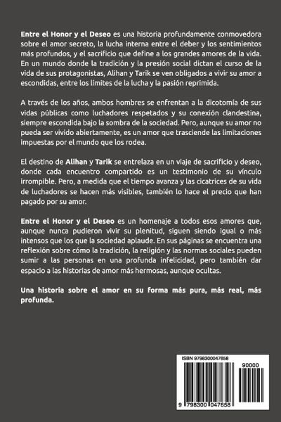Entre el Honor y el Deseo Thom Ramus En el corazón de la lucha libre turca, donde el sudor y el aceite se mezclan con la tradición y el honor, nace una historia de amor que desafía todo lo establecido. Alihan y Tarik, dos hombres fuertes y orgullosos, se encuentran en la arena como rivales, pero fuera de ella descubren una conexión que trasciende las reglas de su mundo. Su relación, vivida en las sombras, se convierte en un refugio secreto que ilumina sus vidas, incluso mientras el peso de la cultura, la religión y las expectativas sociales amenaza con separarlos. Entre el Honor y el Deseo es una obra profundamente emotiva que sigue la trayectoria de estos dos hombres a lo largo de las décadas. Desde sus primeros combates llenos de tensión hasta los encuentros furtivos que los mantuvieron unidos, Thom Ramus pinta un retrato conmovedor de un amor que no necesita ser visible para ser eterno. Es una historia de sacrificio, de cicatrices tanto físicas como emocionales, y de cómo dos almas pueden encontrarse incluso en las circunstancias más adversas. El autor, en su reflexión final, nos invita a mirar más allá de las barreras culturales y sociales que a menudo sumen a las personas en vidas de infelicidad y renuncia. Ramus se adentra con valentía en los matices de una relación que desafía las normas, ofreciendo una crítica sutil pero poderosa a las tradiciones que, aunque pueden ser fuente de identidad, también pueden encerrar a las personas en prisiones invisibles. Con palabras cargadas de poesía y humanidad, convierte esta historia en un homenaje a todos los amores que no han podido vivirse plenamente, pero que no por ello han sido menos intensos o significativos. En sus páginas finales, Ramus reflexiona: "Este libro es para aquellos corazones que han amado en silencio, para esas almas que han encontrado su refugio en la sombra y que, pese a todo, han mantenido su llama encendida." Es un recordatorio de que el amor, por muy oculto que esté, tiene la capacidad de transformar vidas y de perdurar más allá del tiempo. Con una narrativa rica y llena de matices, Entre el Honor y el Deseo no solo cuenta una historia de amor; ofrece una mirada profunda a las fuerzas que moldean nuestras vidas y al poder del amor para resistirlas. Una novela para quienes buscan emocionarse, reflexionar y descubrir la belleza en lo que a menudo permanece oculto.