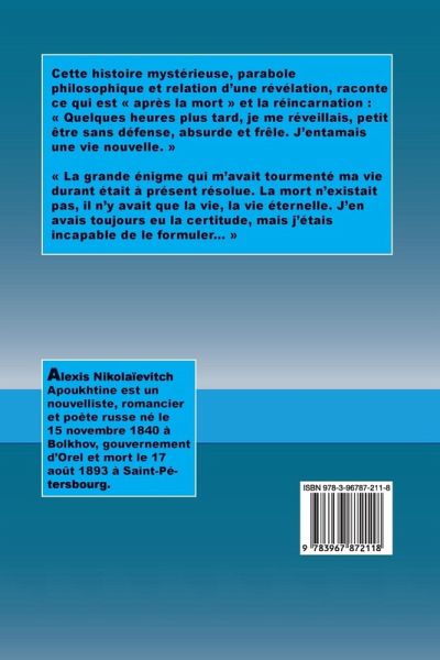 Cette histoire mystérieuse, parabole philosophique et relation d’une révélation, raconte ce qui est « après la mort » et la réincarnation : « Quelques heures plus tard, je me réveillais, petit être sans défense, absurde et frêle. J’entamais une vie nouvelle. » « La grande énigme qui m’avait tourmenté ma vie durant était à présent résolue. La mort n’existait pas, il n’y avait que la vie, la vie éternelle. J’en avais toujours eu la certitude, mais j’étais incapable de le formuler... »