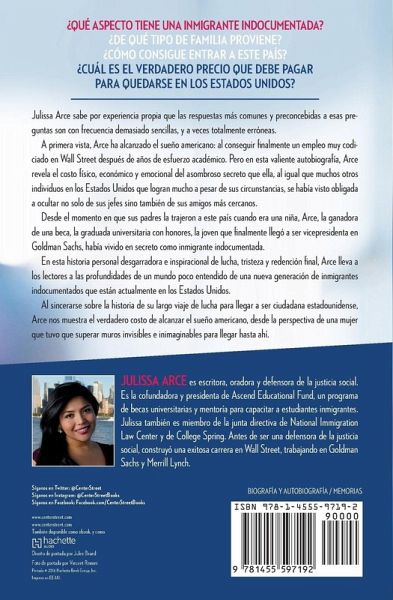¿Qué aspecto tiene una inmigrante indocumentada? ¿De qué tipo de familia proviene? ¿Cómo consigue entrar a este país? ¿Cuál es el verdadero precio que debe pagar para quedarse en los Estados Unidos? Julissa Arce sabe por experiencia propia que las respuestas más comunes y preconcebidas a esas preguntas son con frecuencia demasiado sencillas, y a veces totalmente erróneas. A primera vista, Arce ha alcanzado el sueño americano: al conseguir finalmente un empleo muy codiciado en Wall Street después de años de esfuerzo académico. Pero en esta valiente autobiografía, Arce revela el costo físico, económico y emocional del asombroso secreto que ella, al igual que muchos otros individuos en los Estados Unidos que logran mucho a pesar de sus circunstancias, se había visto obligada a ocultar no solo de sus jefes sino también de sus amigos más cercanos. Desde el momento en que sus padres la trajeron a este país cuando era una niña, Arce, la ganadora de una beca, la graduada universitaria con honores, la joven que finalmente llegó a ser vicepresidenta en Goldman Sachs, había vivido en secreto como inmigrante indocumentada. En esta historia personal desgarradora e inspiracional de lucha, tristeza y redención final, Arce lleva a los lectores a las profundidades de un mundo poco entendido de una nueva generación de inmigrantes indocumentados que están actualmente en los Estados Unidos. Al sincerarse sobre la historia de su largo viaje de lucha para llegar a ser ciudadana estadounidense, Arce nos muestra el verdadero costo de alcanzar el sueño americano, desde la perspectiva de una mujer que tuvo que superar muros invisibles e inimaginables para llegar hasta ahí.