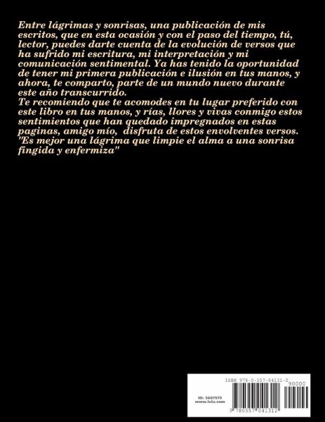 Entre lágrimas y sonrisas, una publicación de mis escritos, que en esta ocasión y con el paso del tiempo, puedes darte cuenta de la evolución de versos que ha sufrido mi escritura, mi interpretación y mi comunicación sentimental. Ya has tenido la oportunidad de tener mi primera publicación e ilusión en tus manos, y ahora, te comparto, parte de un mundo nuevo durante este año transcurrido. Te recomiendo que te acomodes en tu lugar preferido con este libro en tus manos, y rías, llores y vivas conmigo estos sentimientos que han quedado impregnados en estas paginas, amigo mío, disfruta de estos envolventes versos. "Es mejor una lágrima que limpie el alma a una sonrisa fingida y enfermiza"