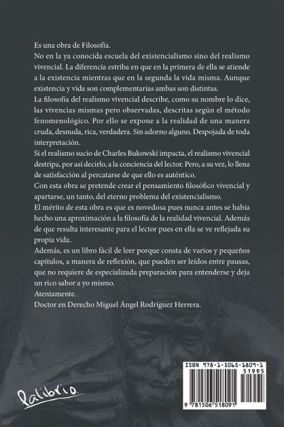 Es una obra de Filosofía. No en la ya conocida escuela del existencialismo sino del realismo vivencial. La diferencia estriba en que en la primera de ella se atiende a la existencia mientras que en la segunda la vida misma. Aunque existencia y vida son complementarias ambas son distintas. La filosofía del realismo vivencial describe, como su nombre lo dice, las vivencias mismas pero observadas, descritas según el método fenomenológico. Por ello se expone a la realidad de una manera cruda, desnuda, rica, verdadera. Sin adorno alguno. Despojada de toda interpretación. Si el realismo sucio de Charles Bukowski impacta, el realismo vivencial destripa, por así decirlo, a la conciencia del lector. Pero, a su vez, lo llena de satisfacción al percatarse de que ello es auténtico. Con esta obra se pretende crear el pensamiento filosófico vivencial y apartarse, un tanto, del eterno problema del existencialismo. El mérito de esta obra es que es novedosa pues nunca antes se había hecho una aproximación a la filosofía de la realidad vivencial. Además de que resulta interesante para el lector pues en ella se ve reflejada su propia vida. Además, es un libro fácil de leer porque consta de varios y pequeños capítulos, a manera de reflexión, que pueden ser leídos entre pausas, que no requiere de especializada preparación para entenderse y deja un rico sabor a yo mismo. Atentamente. Doctor en Derecho Miguel Ángel Rodríguez Herrera.