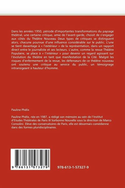 Dans les années 1950, période d'importantes transformations du paysage théâtral, une certaine critique, amie de l'avant-garde, choisit de s'engager aux côtés du Théâtre Nouveau Deux types de critiques se distinguent alors, chacune pourvue d'une influence considérable sur le public. L'une se tient davantage à " l'extérieur " de la représentation, dans un rapport direct entre le journaliste et ses lecteurs. L'autre, comme la revue Théâtre Populaire, se place à " l'intérieur " pour devenir un regard agissant sur l'évolution du théâtre en tant que manifestation de la Cité. Malgré les risques d'enfermement de la revue, les défenseurs de ce théâtre nouveau ont soutenu une critique au service du public, un témoignage intransigeant à hauteur d'homme.