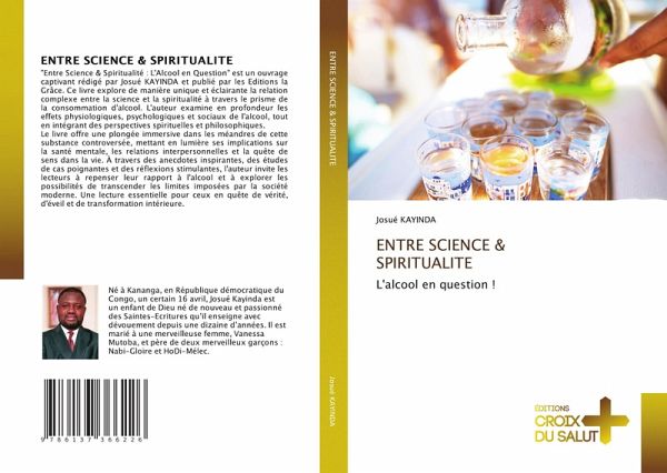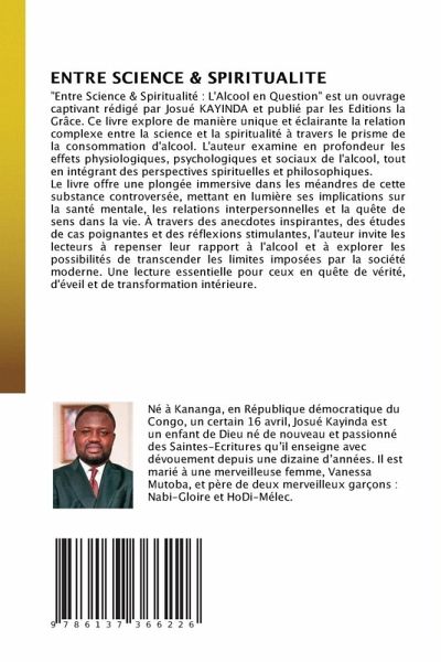 "Entre Science & Spiritualité : L'Alcool en Question" est un ouvrage captivant rédigé par Josué KAYINDA et publié par les Editions la Grâce. Ce livre explore de manière unique et éclairante la relation complexe entre la science et la spiritualité à travers le prisme de la consommation d'alcool. L'auteur examine en profondeur les effets physiologiques, psychologiques et sociaux de l'alcool, tout en intégrant des perspectives spirituelles et philosophiques.Le livre offre une plongée immersive dans les méandres de cette substance controversée, mettant en lumière ses implications sur la santé mentale, les relations interpersonnelles et la quête de sens dans la vie. À travers des anecdotes inspirantes, des études de cas poignantes et des réflexions stimulantes, l'auteur invite les lecteurs à repenser leur rapport à l'alcool et à explorer les possibilités de transcender les limites imposées par la société moderne. Une lecture essentielle pour ceux en quête de vérité, d'éveil et de transformation intérieure.