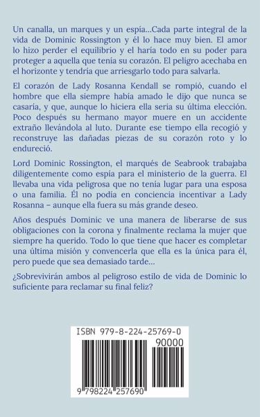 Un canalla, un marques y un espía...Cada parte integral de la vida de Dominic Rossington y él lo hace muy bien. El amor lo hizo perder el equilibrio y el haría todo en su poder para proteger a aquella que tenía su corazón. El peligro acechaba en el horizonte y tendría que arriesgarlo todo para salvarla. El corazón de Lady Rosanna Kendall se rompió, cuando el hombre que ella siempre había amado le dijo que nunca se casaría, y que, aunque lo hiciera ella seria su última elección. Poco después su hermano mayor muere en un accidente extraño llevándola al luto. Durante ese tiempo ella recogió y reconstruye las dañadas piezas de su corazón roto y lo endureció. Lord Dominic Rossington, el marqués de Seabrook trabajaba diligentemente como espía para el ministerio de la guerra. El llevaba una vida peligrosa que no tenía lugar para una esposa o una familia. Él no podía en conciencia incentivar a Lady Rosanna - aunque ella fuera su más grande deseo. Años después Dominic ve una manera de liberarse de sus obligaciones con la corona y finalmente reclama la mujer que siempre ha querido. Todo lo que tiene que hacer es completar una última misión y convencerla que ella es la única para él, pero puede que sea demasiado tarde... ¿Sobrevivirán ambos al peligroso estilo de vida de Dominic lo suficiente para reclamar su final feliz?