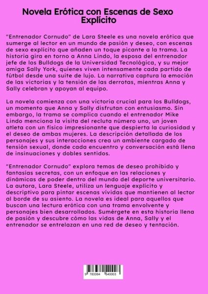 "Entrenador Cornudo" de Lara Steele es una novela erótica que sumerge al lector en un mundo de pasión y deseo, con escenas de sexo explícito que añaden un toque picante a la trama. La historia gira en torno a Anna Lindo, la esposa del entrenador jefe de los Bulldogs de la Universidad Tecnológica, y su mejor amiga Sally York, quienes viven intensamente cada partido de fútbol desde una suite de lujo. La narrativa captura la emoción de las victorias y la tensión de las derrotas, mientras Anna y Sally celebran y apoyan al equipo.La novela comienza con una victoria crucial para los Bulldogs, un momento que Anna y Sally disfrutan con entusiasmo. Sin embargo, la trama se complica cuando el entrenador Mike Lindo menciona la visita del recluta número uno, un joven atleta con un físico impresionante que despierta la curiosidad y el deseo de ambas mujeres. La descripción detallada de los personajes y sus interacciones crea un ambiente cargado de tensión sexual, donde cada encuentro y conversación está llena de insinuaciones y dobles sentidos."Entrenador Cornudo" explora temas de deseo prohibido y fantasías secretas, con un enfoque en las relaciones y dinámicas de poder dentro del mundo del deporte universitario. La autora, Lara Steele, utiliza un lenguaje explícito y descriptivo para pintar escenas vívidas que mantienen al lector al borde de su asiento. La novela es ideal para aquellos que buscan una lectura erótica con una trama envolvente y personajes bien desarrollados. Sumérgete en esta historia llena de pasión y descubre cómo las vidas de Anna, Sally y el entrenador se entrelazan en una red de deseo y tentación.