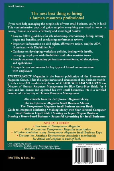 The next best thing to hiring a human resources professional If you need help managing the people side of your small business, you're in luck! This comprehensive, practical guide supplies everything you need to know to manage human resources effectively and avoid legal hassles: * Easy-to-follow guidelines for job advertising, interviewing, hiring, setting wages and benefits, and conducting performance reviews. * Important information on civil rights, affirmative action, and the ADA (Americans with Disabilities Act). * Guidance on developing workplace policies, dealing with layoffs, managing employees with disabilities, and other sensitive issues. * Sample documents, including performance review forms, job descriptions, and applications. * Sample letters and memos for key types of formal communication with employees. Also available from the Entrepreneur Magazine library: * The Entrepreneur Magazine Small Business Advisor * The Entrepreneur Magazine Small Business Answer Book * Guide to Integrated Marketing * Making Money with Your Personal Computer * Small Business Legal Guide * Starting an Import/Export Business * Starting a Home-Based Business * Successful Advertising for Small Businesses SPECIAL OFFERS! * Free issue of Entrepreneur Magazine. * 50% discount on Entrepreneur Magazine subscription. * 1/2 price admission to any Entrepreneur Magazine Small Business Expo. * Discount on American Entrepreneurs Association membership. See details and coupons in back of book.