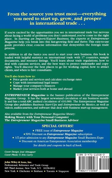 From the source you trust most-everything you need to start up, grow, and prosper in international trade... If you're excited by the opportunities you see in international trade but nervous about facing a world of problems you don't understand, you've come to the right place. In Starting an Import/Export Business, the experts at Entrepreneur Magazine help you break into this fast-growing field and thrive. You'll find the whole story on the import/export business in this easy-to-use guide--clear concise information that demystifies the foreign trade process and explains precisely what clients expect from import/export services. In addition to all the basics you need to start your own business, this book is loaded with helpful statistics on international trade with 17 countries, sample documents, and resource listings. You'll learn about trade regulations, how to deal with customs services, and the best ways to protect trademarks and copyrights. You'll discover the best places to go for working capital, how to attract clients, and when to hire consultants. You'll also learn how to: * Price goods and services and calculate exchange rates. * Choose the best payment method for each transaction. * Cope with international legal issues. * Manage your company's finances. * Market your services both at home and abroad. * Hook up with import and export distribution systems. There's never been a better time to launch yourself into the exciting world of international trade, and Starting an Import/Expert business is the ideal book to get you going. ENTREPRENEUR Magazine is the banner publication of the Entrepreneur Magazine Group. It has the largest newsstand circulation of any business monthly and has a total ABC audited circulation of 385,000. The Entrepreneur Magazine Group also publishes Business Start-Ups and Entrepreneur in Mexico, as well as videos, audiocassettes, and software that deal with business start-up management. Also available from the Entrepreneur Magazine library: Making Money With Your Personal Computer, The Entrepreneur Magazine Small Business Advisor.