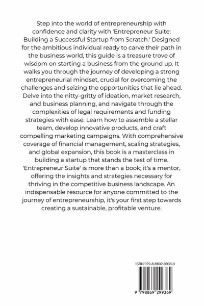 "Entrepreneur Suite: Building a Successful Startup from Scratch" is an essential guide for aspiring entrepreneurs ready to embark on their business journey. This comprehensive book covers every aspect of starting a business, from developing an entrepreneurial mindset to scaling your business for global expansion. With detailed chapters on ideation, market research, business planning, legal considerations, funding strategies, team building, product development, marketing, financial management, and much more, it provides a roadmap for building a successful startup from the ground up. Whether you're looking to innovate, expand your market reach, or navigate the complexities of international business, this book offers the insights and strategies needed to thrive in today's competitive landscape. It's an invaluable resource for anyone committed to creating a sustainable, profitable business.