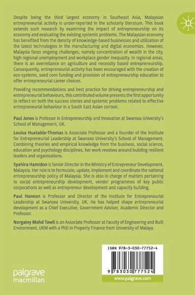 Paul Jones is Professor in Entrepreneurship and Innovation at Swansea University's School of Management, UK. Louisa Huxtable-Thomas is Associate Professor and a founder of the Institute for Entrepreneurial Leadership at Swansea University's School of Management. Combining theories and empirical knowledge from the business, social science, education and psychology disciplines, her work revolves around building resilient leaders and organisations. Syahira Hamidon is Senior Director in the Ministry of Entrepreneur Development, Malaysia. Her role is to formulate, update, implement and coordinate the national entrepreneurship policy of Malaysia. She is also in charge of matters pertaining to social entrepreneurship development, vendor programmes of key public corporations as well as entrepreneur development and capacity building. Paul Hannon is Professor and Director of the Institute for Entrepreneurial Leadership at Swansea University, UK. He has helped shape entrepreneurial development as a Chief Executive, Government Adviser, Academic Director and Professor. Norngaoiny Binti Mohd Tawil is an Associate Professor at Faculty of Engineering and Built Environment, UKM with a PhD in Property Finance from University of Malaya.