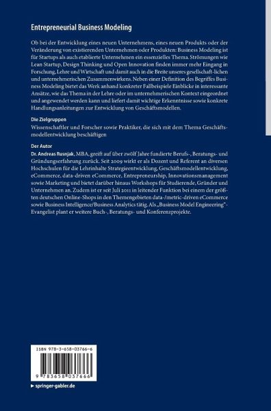 Dr. Andreas Rusnjak, MBA, greift auf über zwölf Jahre fundierte Berufs-, Beratungs- und Gründungserfahrung zurück. Seit 2009 wirkt er als Dozent und Referent an diversen Hochschulen für die Lehrinhalte Strategieentwicklung, Geschäftsmodellentwicklung, eCommerce, data-driven eCommerce, Entrepreneurship, Innovationsmanagement sowie Marketing und bietet darüber hinaus Workshops für Studierende, Gründer und Unternehmen an. Zudem ist er seit Juli 2011 in leitender Funktion bei einem der größten deutschen Online-Shops in den Themengebieten data-/metric-driven eCommerce sowie Business Intelligence/Business Analytics tätig. Als "Business Model Engineering"-Evangelist plant er weitere Buch-, Beratungs- und Konferenzprojekte.
