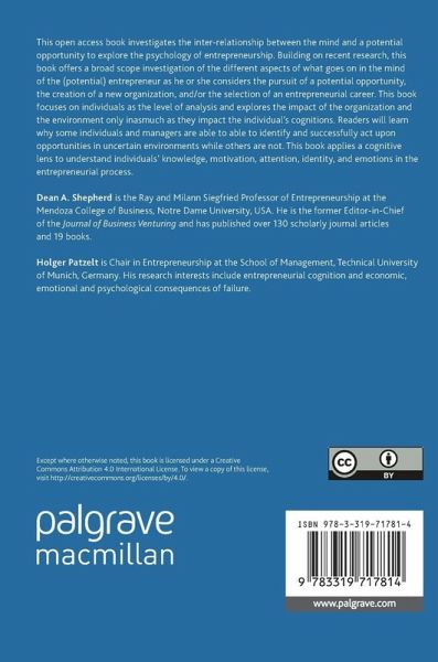 This open access book investigates the inter-relationship between the mind and a potential opportunity to explore the psychology of entrepreneurship. Building on recent research, this book offers a broad scope investigation of the different aspects of what goes on in the mind of the (potential) entrepreneur as he or she considers the pursuit of a potential opportunity, the creation of a new organization, and/or the selection of an entrepreneurial career. This book focuses on individuals as the level of analysis and explores the impact of the organization and the environment only inasmuch as they impact the individual's cognitions. Readers will learn why some individuals and managers are able to able to identify and successfully act upon opportunities in uncertain environments while others are not. This book applies a cognitive lens to understand individuals' knowledge, motivation, attention, identity, and emotions in the entrepreneurial process.